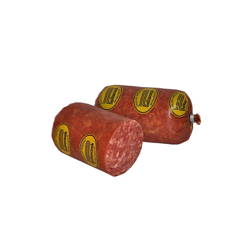 Schweinewurst, fein zerkleinert, gepökelt, geräuchert, roh. Künstliche Hülle.Zutaten: Schweinefleisch 82%, Trinkwasser, Schweinefett 3%, Speisesalz,Geschmacksverstärker-Natriumglutamat, Gewürze, Zucker, Gewürzextrakte,Essig, SchweineeiweiB, Antioxidationsmittel-Natriumisoascorbat,Säureregulator- E575, Hefeextrakt, Aromen;Konservierungsstoff-Natriumacetat, Natriumnitrit; Farbstoff-Karmin.Das Produkt kann enthalten: GLUTEN, SOJA, SELLERIE, SENF,SCHWEFELDIOXID, einschlieBlich LAKTOSE MILCH.Nach dem öffnen im Kühlschrank aufbewahren.